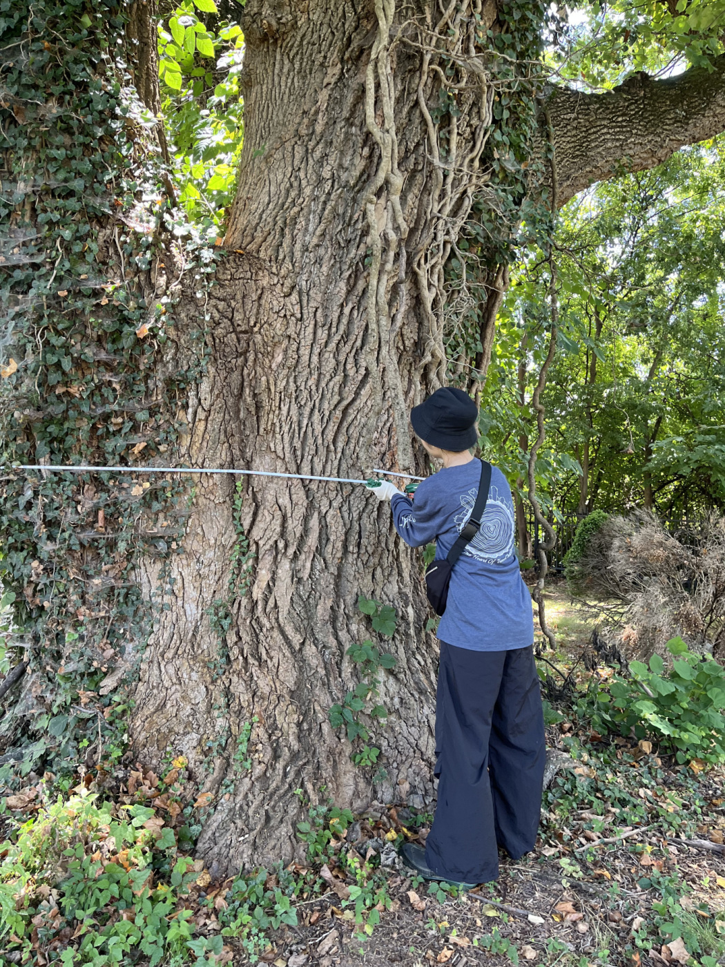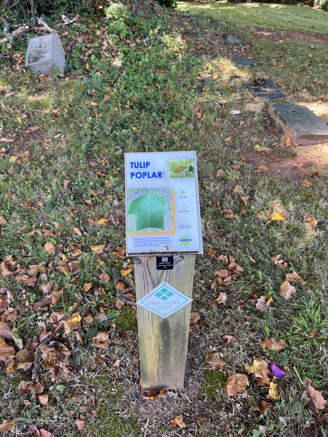 This tree stands at the back of the cemetery, near the edge of the property. Its Treasure Tree tag is located on a plaque next to the tree.