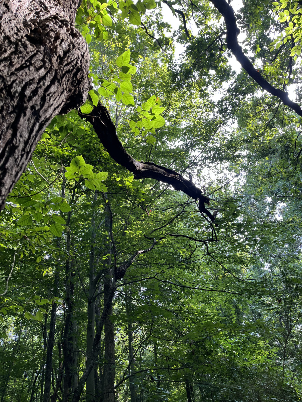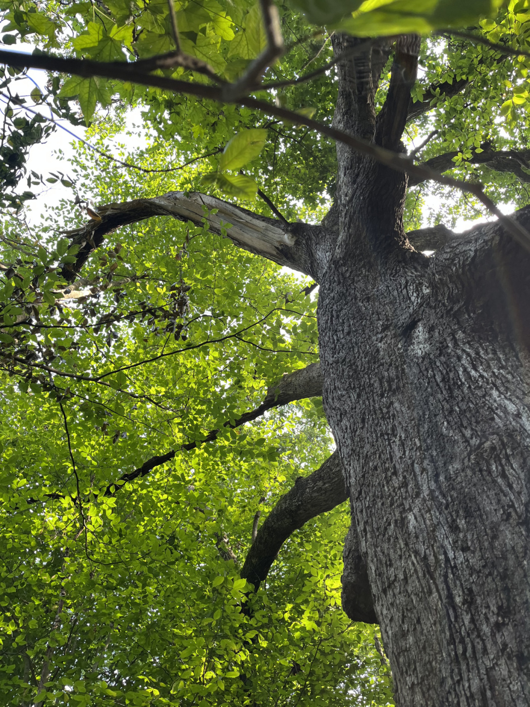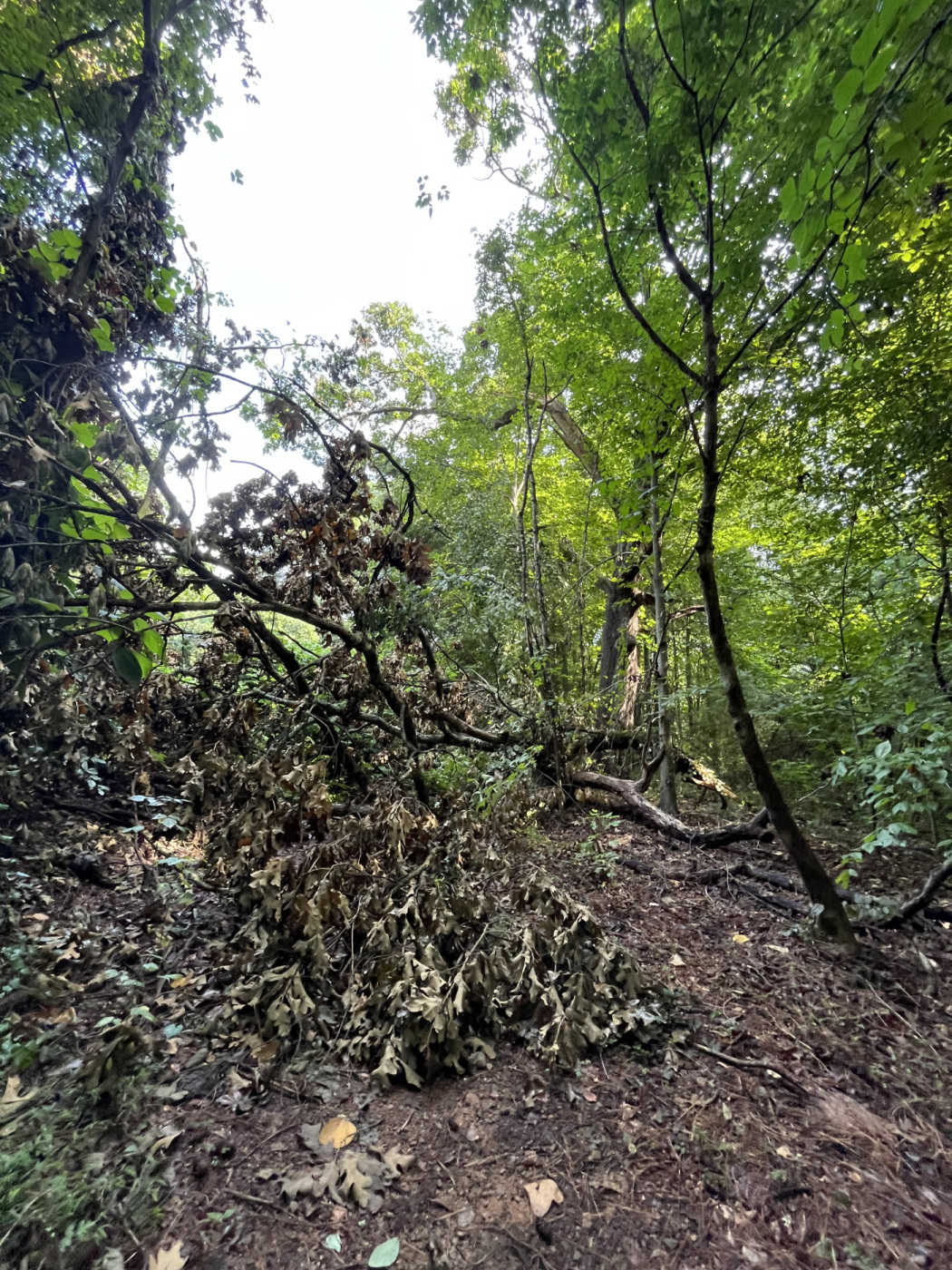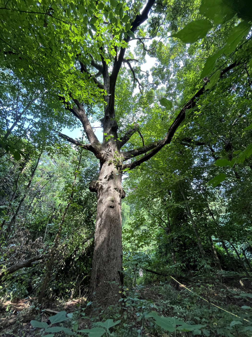 Original photos of this large tree show a metal bucket nailed onto the side at chest level. This was a typical method of collecting sap, a practice usually done with pine varieties. Not much is known about the history of this Post Oak, but a piece of wood in which the bucket would have been nailed to is still present. The tree stands just off the right side of the Hoyt Hinson Trail.