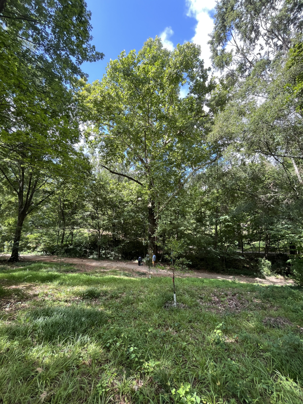 Like many large sycamores, this huge specimen stands right on the north bank of the small creek that runs through the middle of Latta Park. This park was originally opened in 1891 through the vision of developer Edward Dilworth Latta. It was originally designed around Lake Forsythe, which can be seen through the terraced slopes of the park that lead down to the creek.