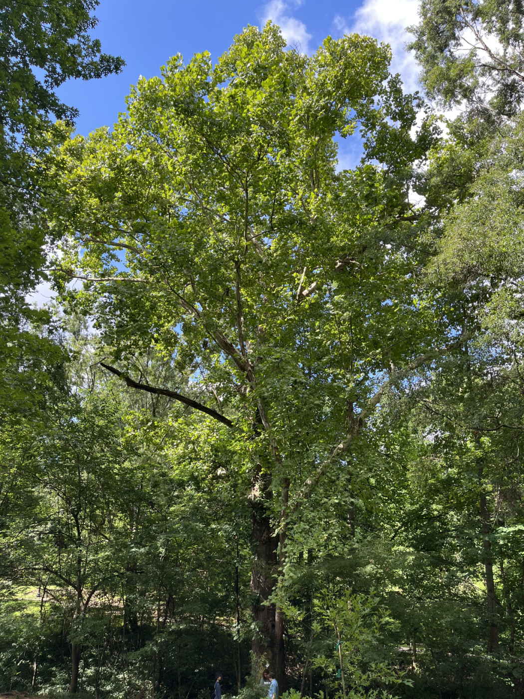 Like many large sycamores, this huge specimen stands right on the north bank of the small creek that runs through the middle of Latta Park. This park was originally opened in 1891 through the vision of developer Edward Dilworth Latta. It was originally designed around Lake Forsythe, which can be seen through the terraced slopes of the park that lead down to the creek.