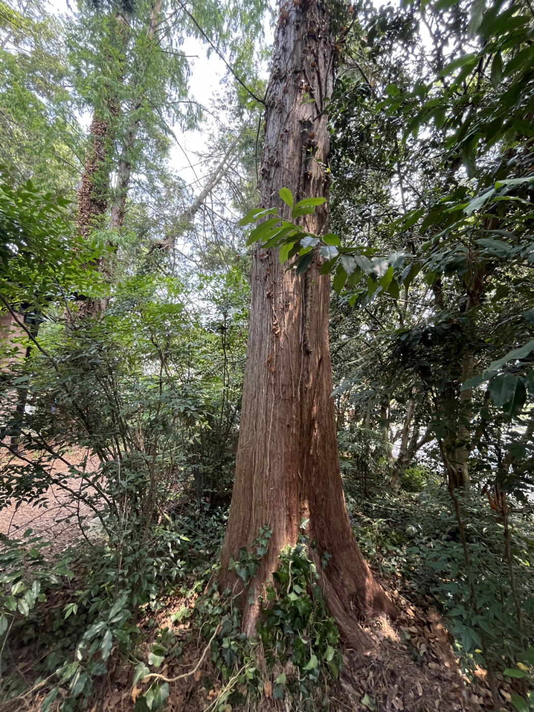 This Bald Cypress was planted in the 1970s by Herbert Hechenbleikner, a biology professor who founded the UNCC Botanical Gardens. He was also a good friend of the VanLandingham family, which in the 1960s allowed the VanLandingham grounds to be converted into a living laboratory for UNCC. All of the original Treasure Trees onsite -- #078, #079, #080, #081, #082, #083 -- were planted in the early 1970s under Hechenbleikner’s direction. This Bald Cypress stands at the corner of the property, alongside Belvedere Avenue, next to its sister tree, #081. It can be distinguished by its dual trunks.