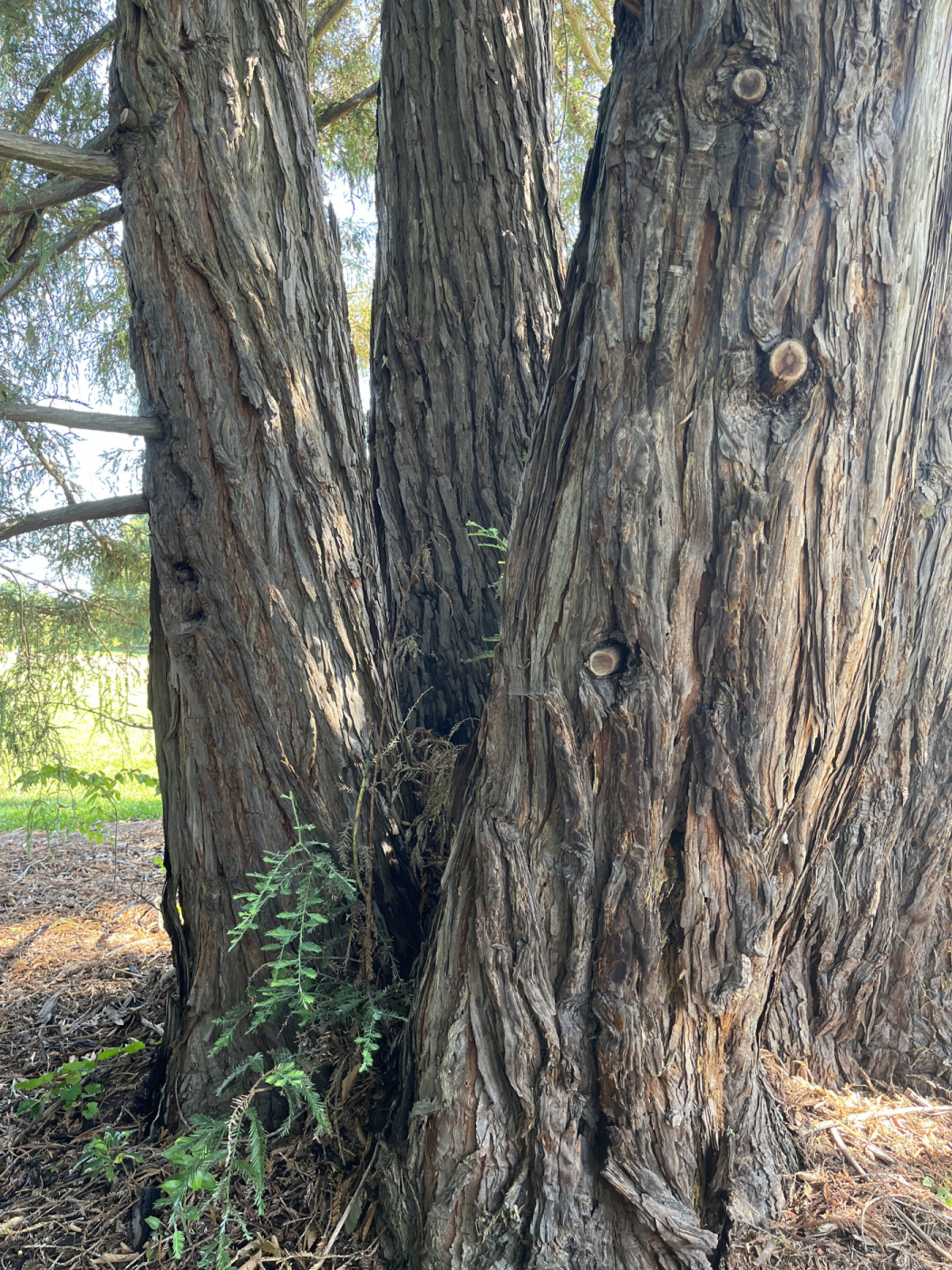 This Coast Redwood has four main trunks, forming a cathedral-like shape. This occurs when the mother tree dies and the offspring originally surrounding the trunk mature. The manager of the property says that the heat of the southeast wears on this Redwood and it’s constantly transpiring water due to hot temperatures throughout the day.