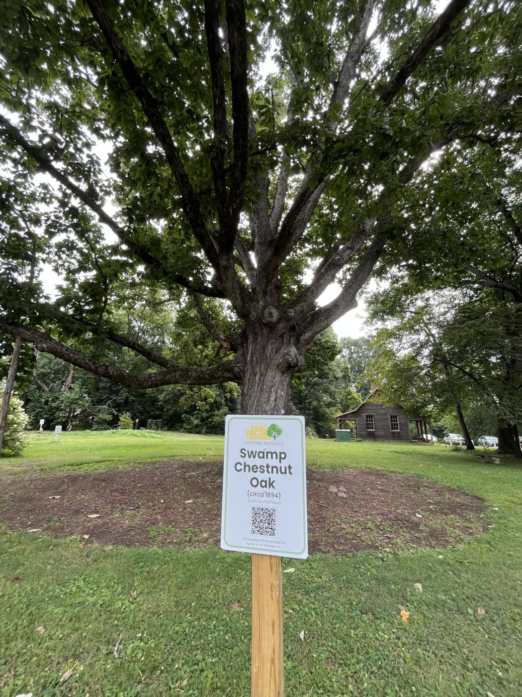 This Swamp Chestnut Oak is located at Historic Rosedale. According to the foundation’s website: “In 1894, this tree was brought to the plantation in a sack, as a gift, to Robert Baxter Caldwell, the third generation to live on the plantation. For many years, this tree was the shade tree for the paddock, which was a fenced area surrounded by barns and livestock quarters. Hogs and cows ate the nuts dropped by the tree and horses were allowed to rest there before being placed in their stalls.” It is located at the right of the drive, before arriving at the Visitor’s Center.