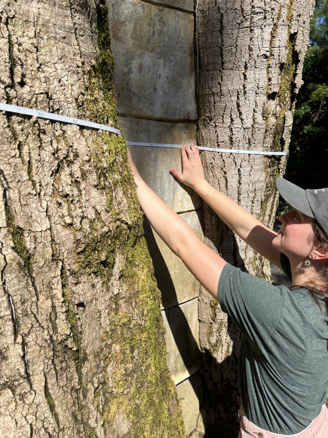 This tree stands on the Duke Mansion property. In 1919 James "Buck" Duke, known for his involvement in Duke University and modern cigarette production, purchased the home. Buck was ambitious in improving the grounds and he wished to save this Yellow Poplar near the entrance of the property. This tree has survived hurricanes and a large amount of wood decay. In order to combat this decay, concrete was poured into the trunk to maintain the tree. You can still see the concrete in the tree if you're entering from the driveway.