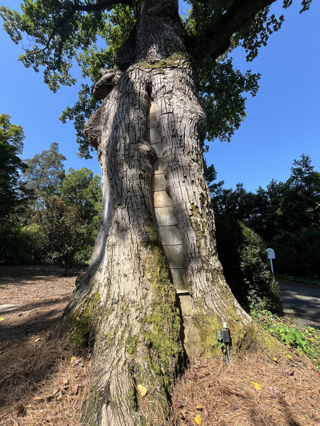 This tree stands on the Duke Mansion property. In 1919 James "Buck" Duke, known for his involvement in Duke University and modern cigarette production, purchased the home. Buck was ambitious in improving the grounds and he wished to save this Yellow Poplar near the entrance of the property. This tree has survived hurricanes and a large amount of wood decay. In order to combat this decay, concrete was poured into the trunk to maintain the tree. You can still see the concrete in the tree if you're entering from the driveway.