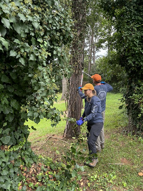 Our volunteers and staff care for young trees, mulch mature trees and provide support to combat invasive vines. Invasive vines, such as English ivy, Chinese wisteria, and Kudzu, aggressively take over and kill native trees.